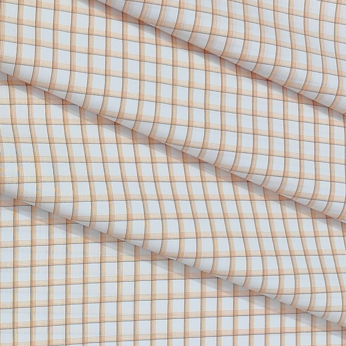 This premium quality shirt fabric by Arvind is perfect for men's formal shirts. With a cotton blend, it offers both luxury and comfort. Its light orange and brown check pattern adds a touch of sophistication to any outfit. Upgrade your wardrobe with this versatile and stylish choice.
